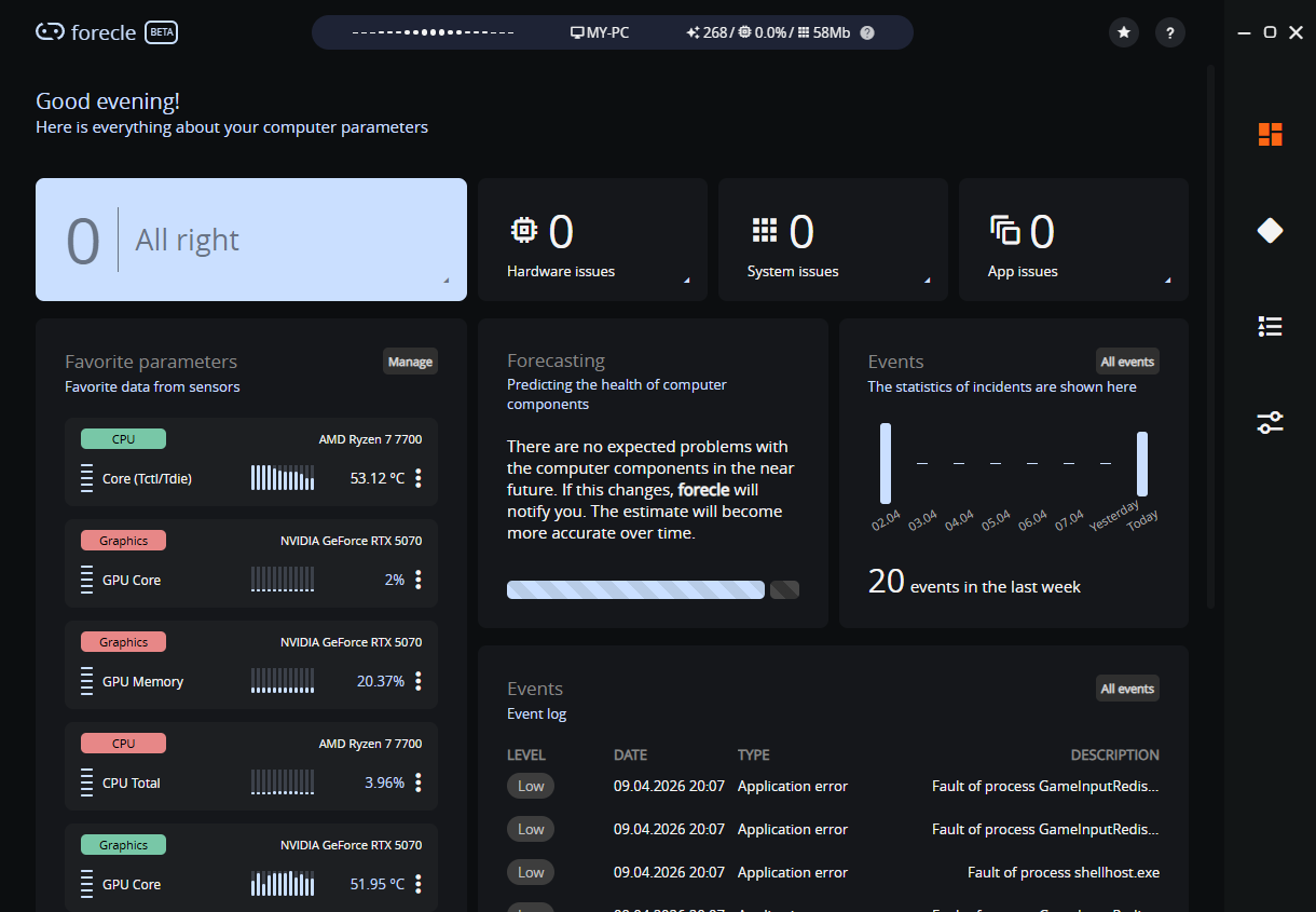 Forecle monitors the state of your computer – collects data from sensors and OS events, and analyzes it using artificial intelligence technologies.