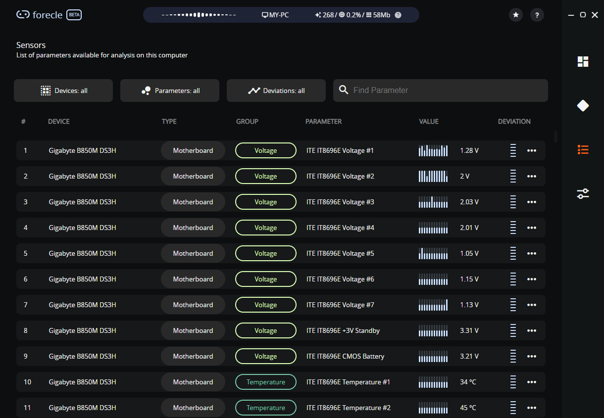 Forecle’s graphical interface allows you to monitor the state of all computer components: track parameter values and their deviation from the norm.